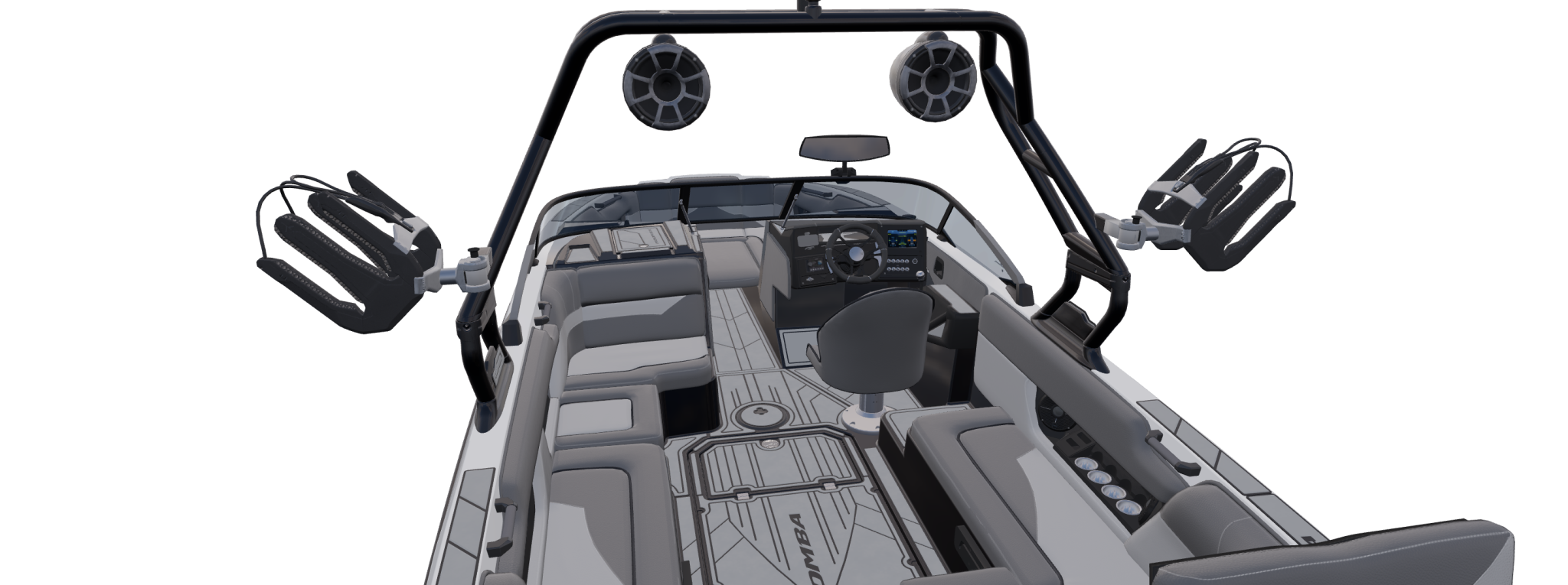 The helm feels confident and connected, with a digital touchscreen at the core of the dash system. The driver can adjust surf tabs, ballast distribution, and speed controls instantly, creating repeatable wave profiles every ride. LED lighting and refined finishes bring a modern tone without overcomplicating the setup. Every control feels functional and solid, designed for the rigors of real‑world watersport use.