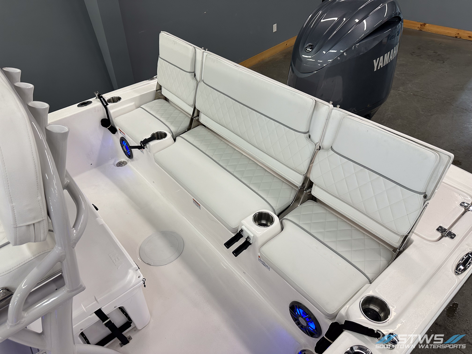 The Bay Fox 231 carries Sea Fox’s unmistakable blend of purpose and polish. With room for eight on board, it’s thoughtfully designed for both performance and connection. The helm station centers on a Garmin 94SV UHD touchscreen with Key Assist and a thru-hull transducer (P19), creating a cockpit that feels intuitive and advanced without feeling overwhelming. For anglers, the pre-rig for a 24-volt trolling motor streamlines the setup, while the freshwater washdown with a five-gallon tank keeps decks and gear spotless after a day in the salt.