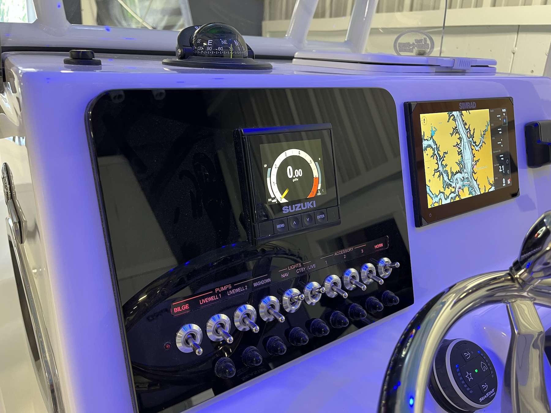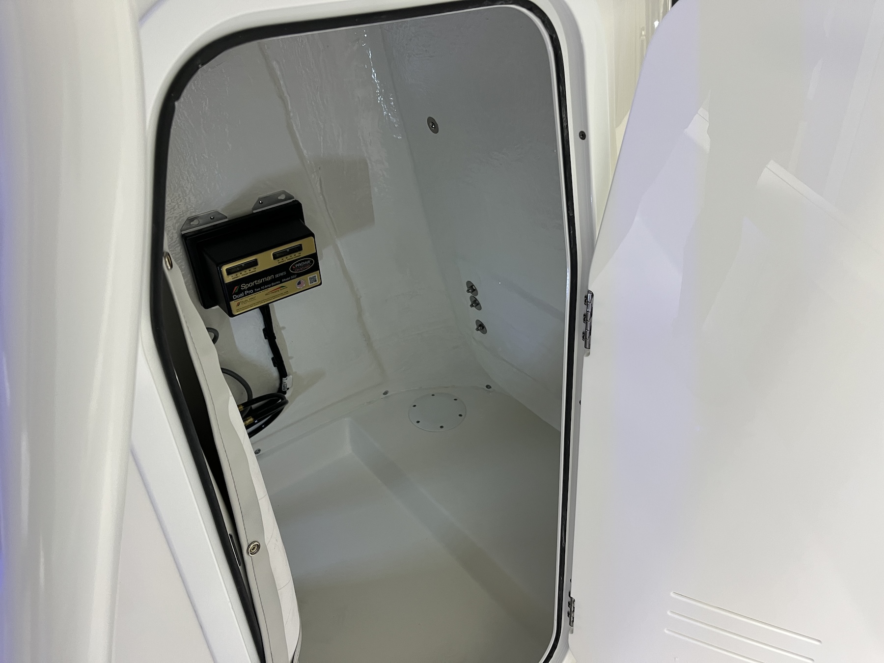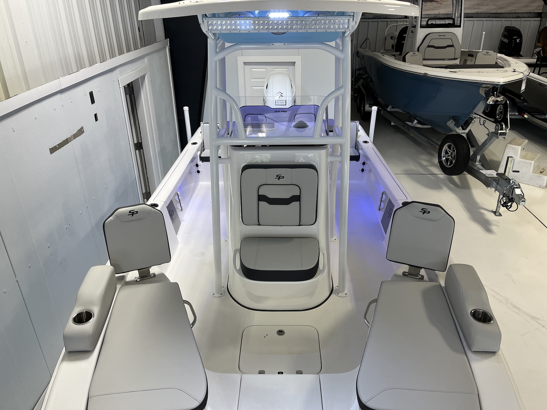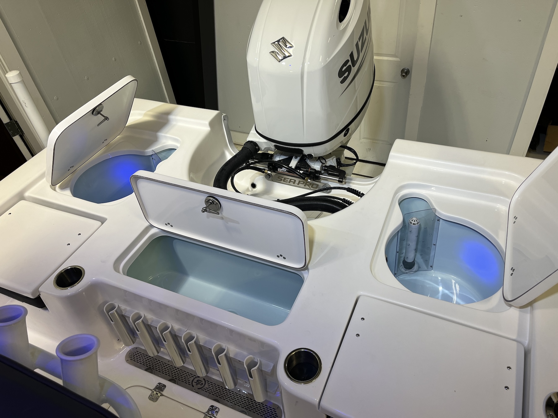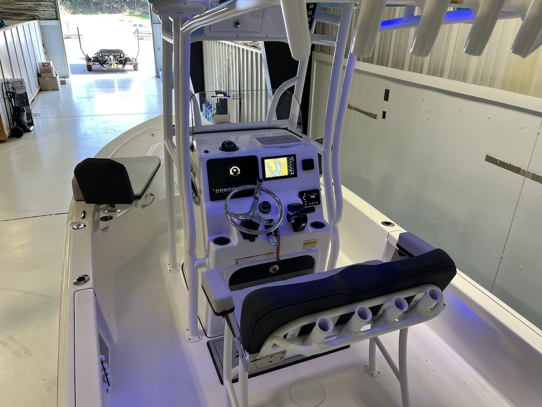 Sea Pro’s optional electronic accessories include stereo systems, LED lighting, raw-water washdowns, and livewells, each installed with precision to preserve both form and function. Wiring and plumbing routes are neatly executed to simplify future upgrades or service.