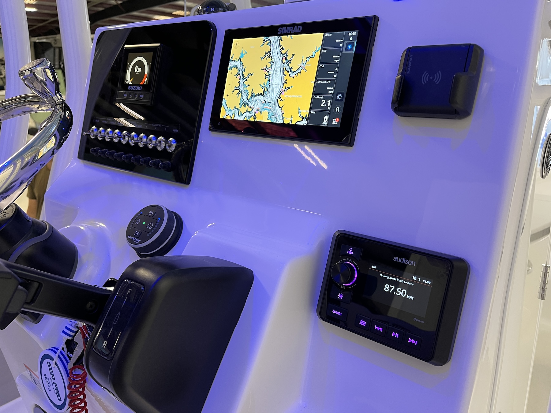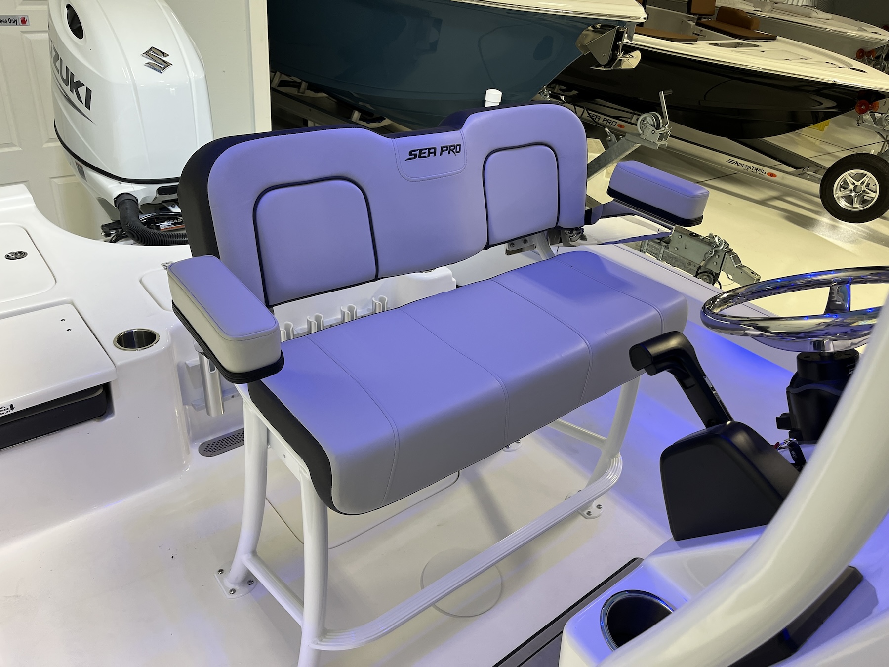 The helm layout emphasizes clarity and minimal distraction. Large displays can be installed for GPS, sonar, or engine diagnostics, and the tilt-adjustable wheel adapts to different operators. Sea Pro has engineered the control placement to enhance the natural line of vision, reducing fatigue and increasing safety during longer runs. The Suzuki engine integrates seamlessly with digital gauges, giving instant performance feedback without cluttering the dash.
