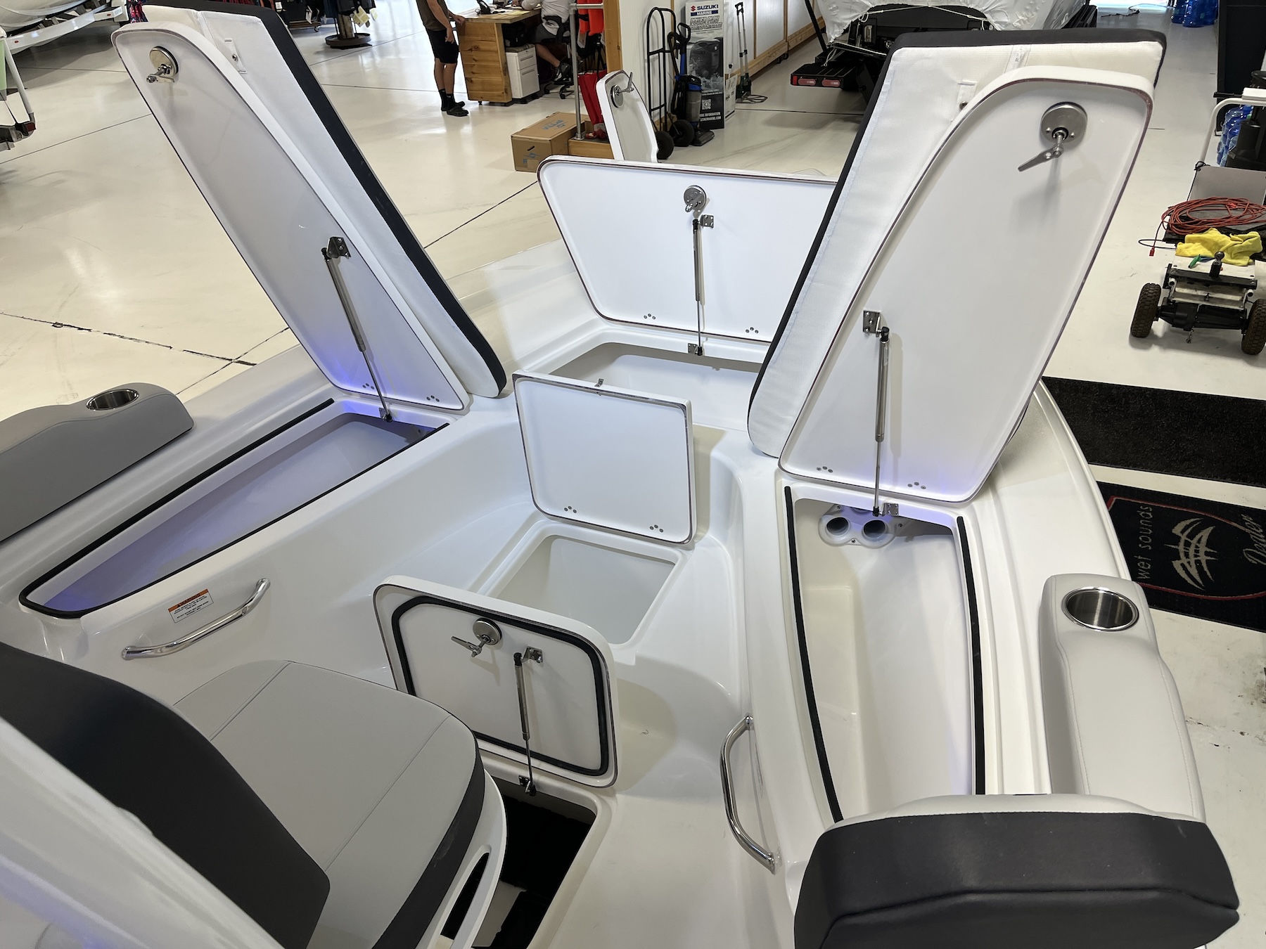 Attention to finish is evident throughout. Molded non-skid surfaces provide traction without harshness underfoot. The upholstery uses marine-grade materials resistant to UV, mildew, and salt. Latches, hinges, and rails fit snugly, eliminating the rattles and wear points that can reveal lesser construction. The color options, stitching accents, and subtle branding reinforce the 230 DLX’s modern yet understated style.