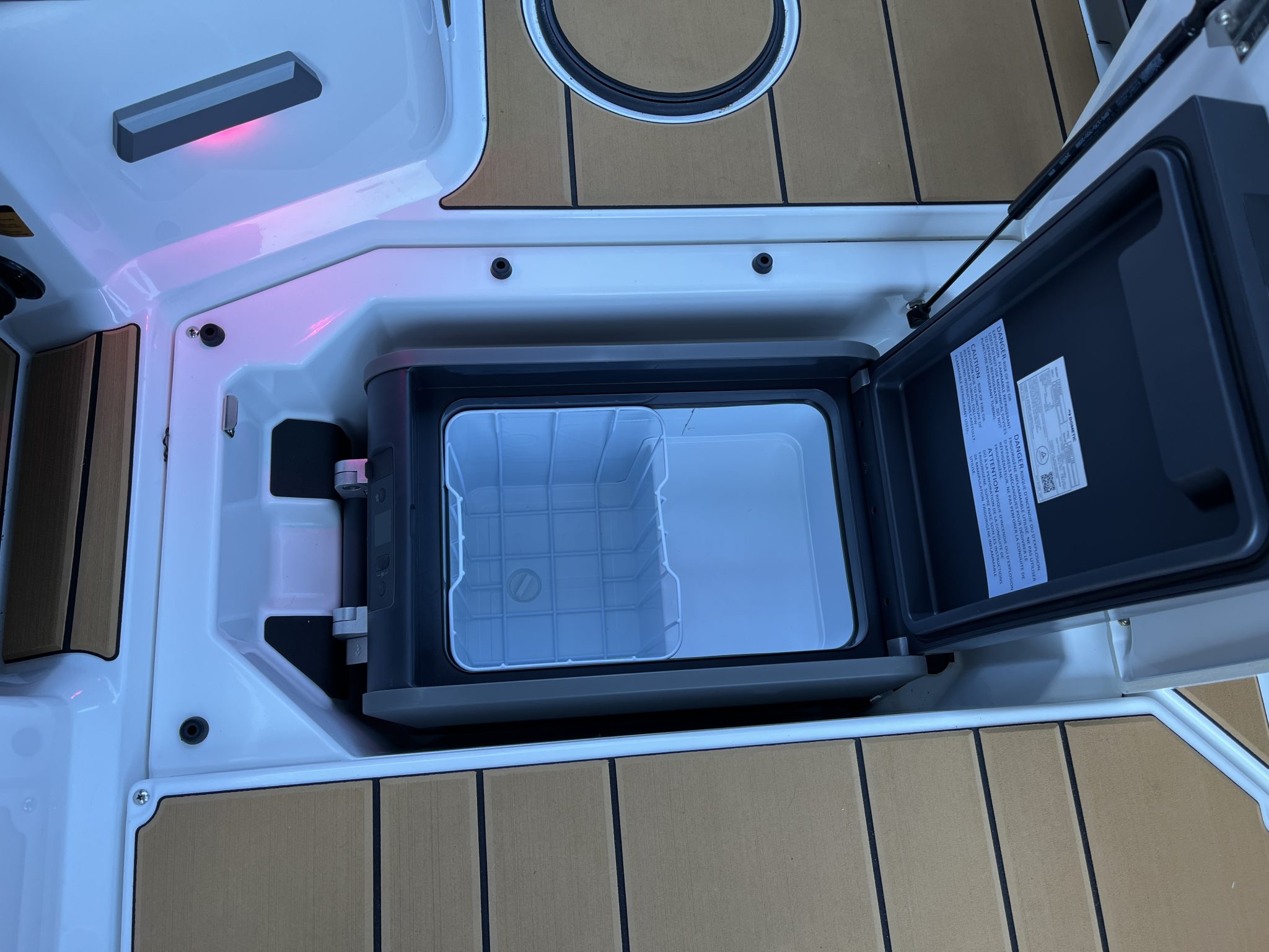 Storage has been cleverly integrated throughout the interior, with dedicated compartments for boards, ropes, vests, and accessories. The transom walkthrough design also makes boarding and water access easy, keeping debarked gear away from the main lounge area. Supra’s ergonomic helm setup combines analog precision with digital simplicity. The touchscreen interface is designed for quick response, and digital switching streamlines control over lighting, ballast, audio, and navigation aids.