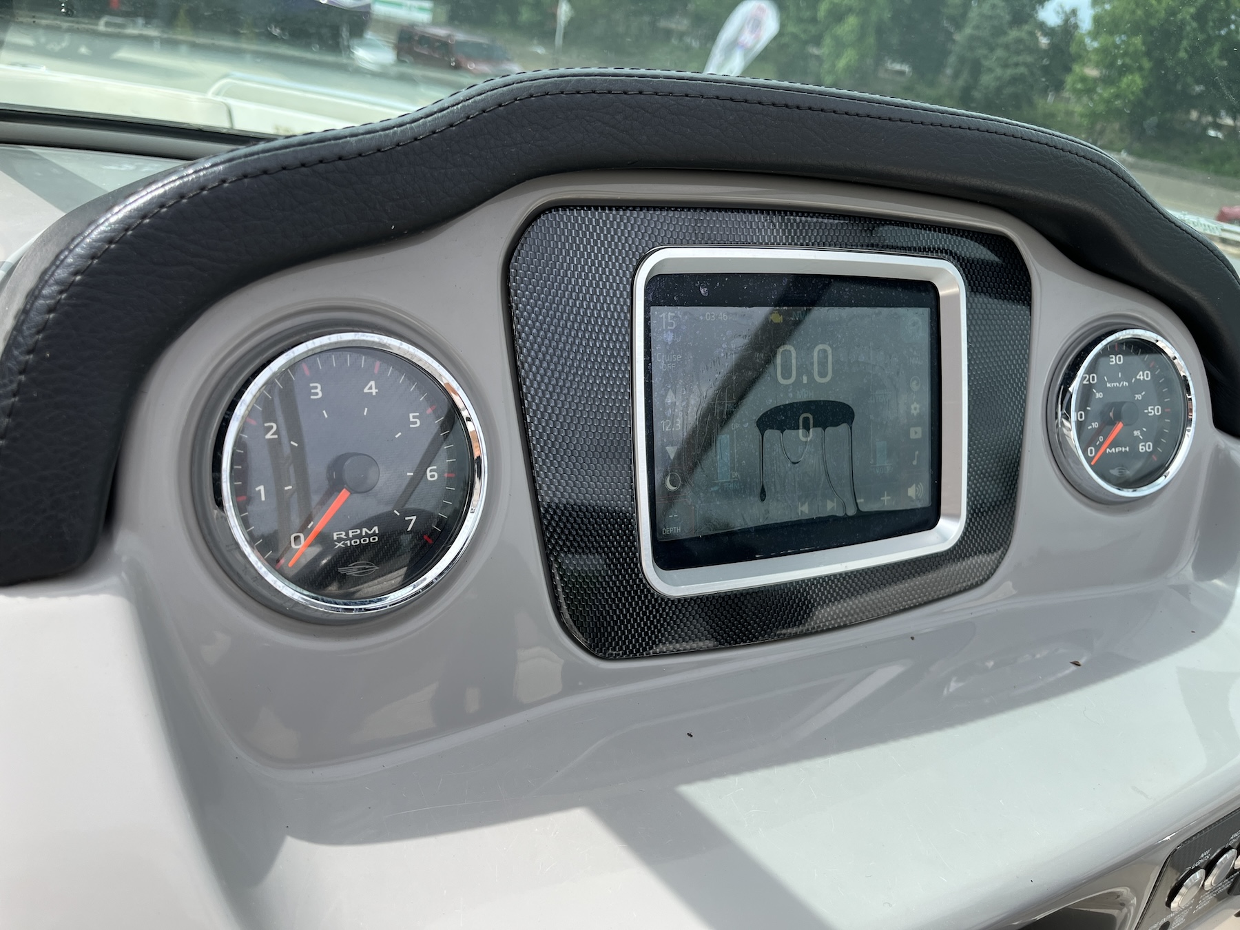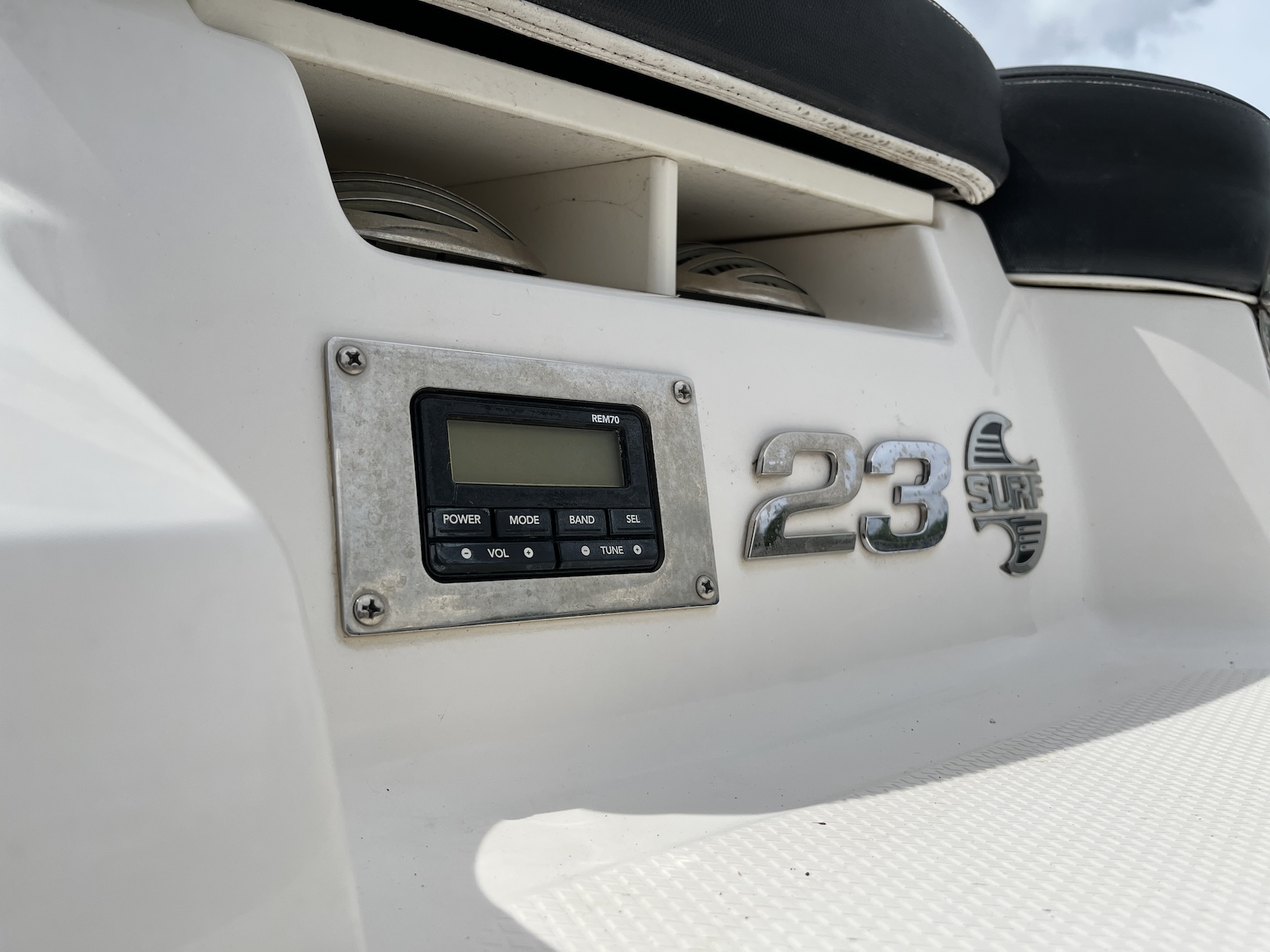 Beneath the deck sits a reliable V6 280 HP engine that keeps the fun going across mixed conditions. With 1,083 hours logged, this engine has proven its dependability on the water. The 23 H2O Surf uses Chaparral’s renowned Surf package to generate clean, rideable waves at the touch of a control. This setup includes variable ballast adjustments allowing fine-tuning of the wave shape, providing ideal surf conditions for both beginners and advanced riders. The hull design offers superior tracking and control, ensuring confident handling at all speeds and wake sizes.