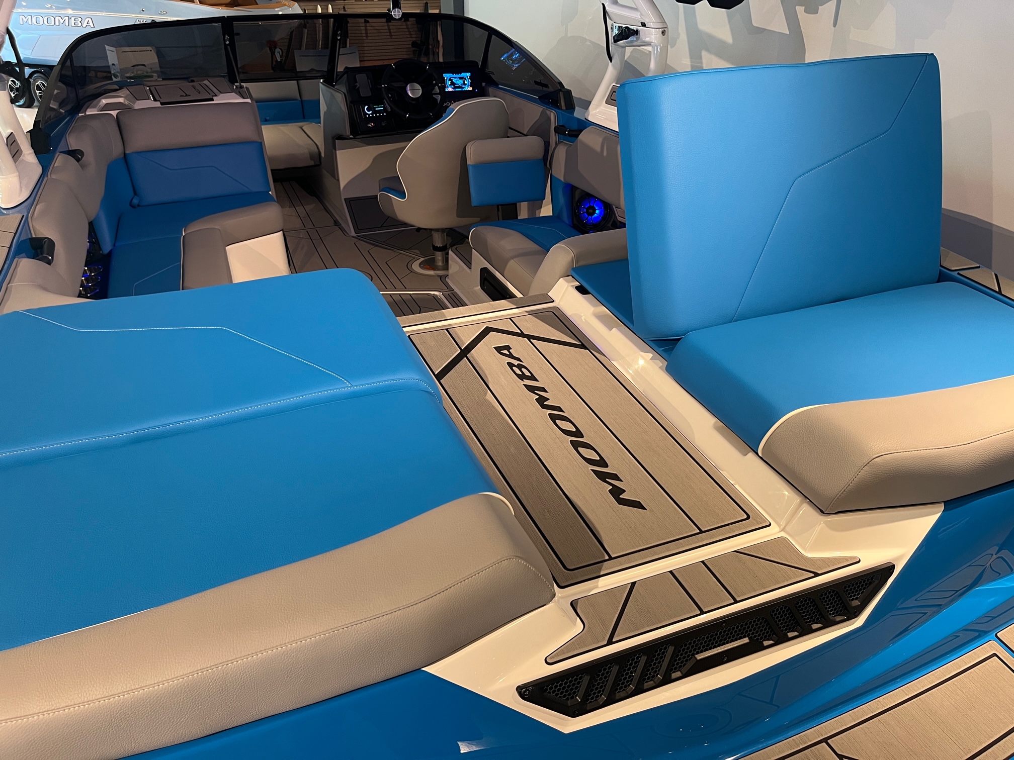 The 2025 Moomba Max comes standard with a long list of equipment often found as optional upgrades on competitors. This includes integrated ballast systems exceeding 4,000 lbs, a color touchscreen helm interface, and Moomba’s AutoWake technology, which automatically adjusts pitch and roll for consistent wakes. By comparison, the Axis A22 requires the Surf Gate and Power Wedge options to achieve similar functionality, while the Malibu 22 LSV relies on add-on packages for full wake optimization.