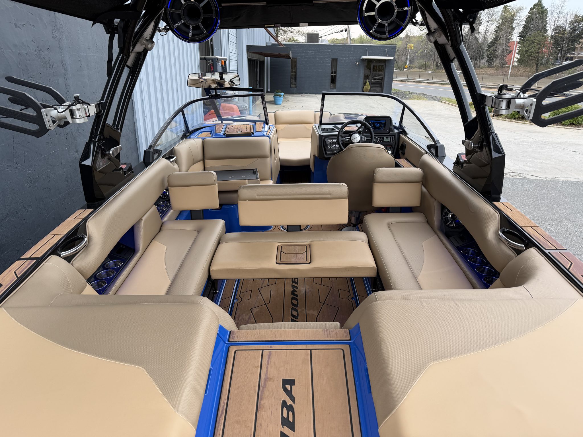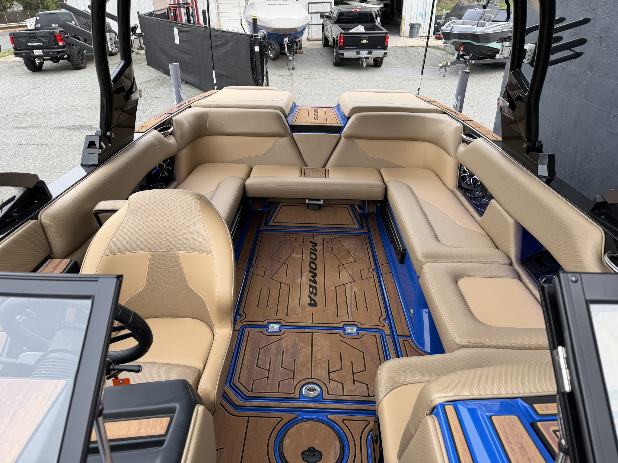 Inside, the Blue-and-Tan color scheme delivers a balanced aesthetic—sporty with a touch of sophistication. Plush marine foam flooring, high bolsters, deep storage compartments, and a spacious walkthrough design create a layout that works as hard at rest as it does underway. The transom swim platform stays level for easy board setup, and the convertible rear seating transforms the cockpit into a viewing lounge for surf sessions. Moomba’s attention to function is evident in every corner: durable upholstery built to resist fading, stainless steel accents that hold up to heavy use, and intuitive dash technology that makes operation simple. The touchscreen interface brings together ballast control, lighting, and surf settings in one easy display, allowing the driver to focus more on towing and less on tweaks.