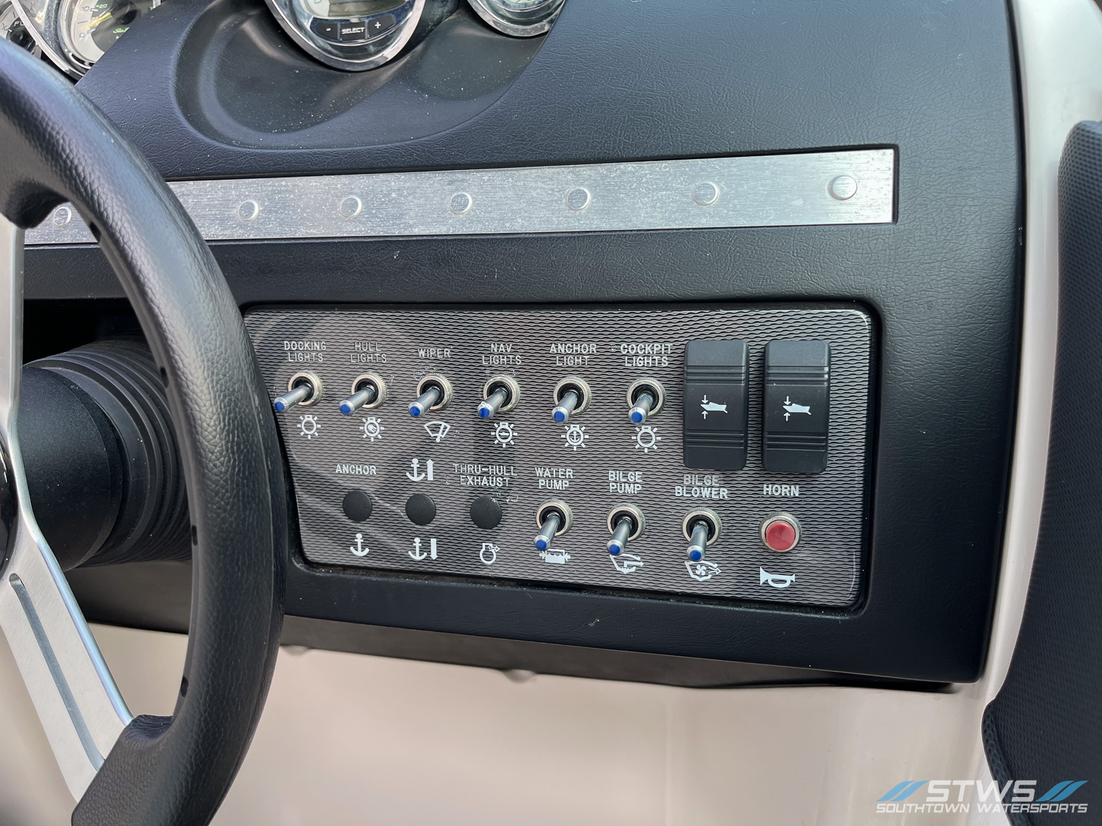 The helm is neatly arranged for intuitive control. With clear gauges, a tilt wheel, and well‑placed switches, the driver can manage speed, trim, and audio with ease. The sound system provides clear playback across the boat, setting the tone whether you’re cruising a quiet morning shoreline or picking up the pace mid‑day.