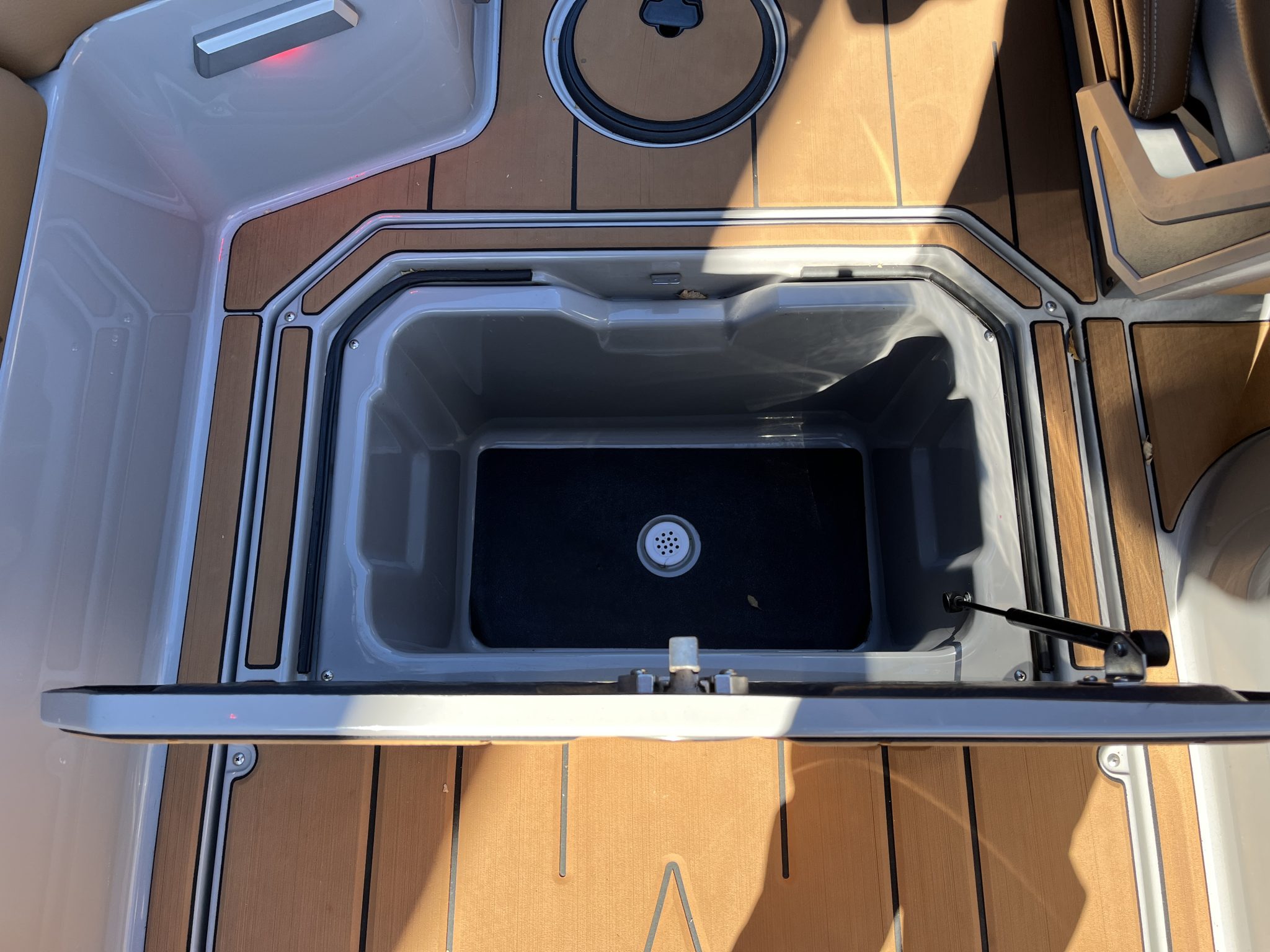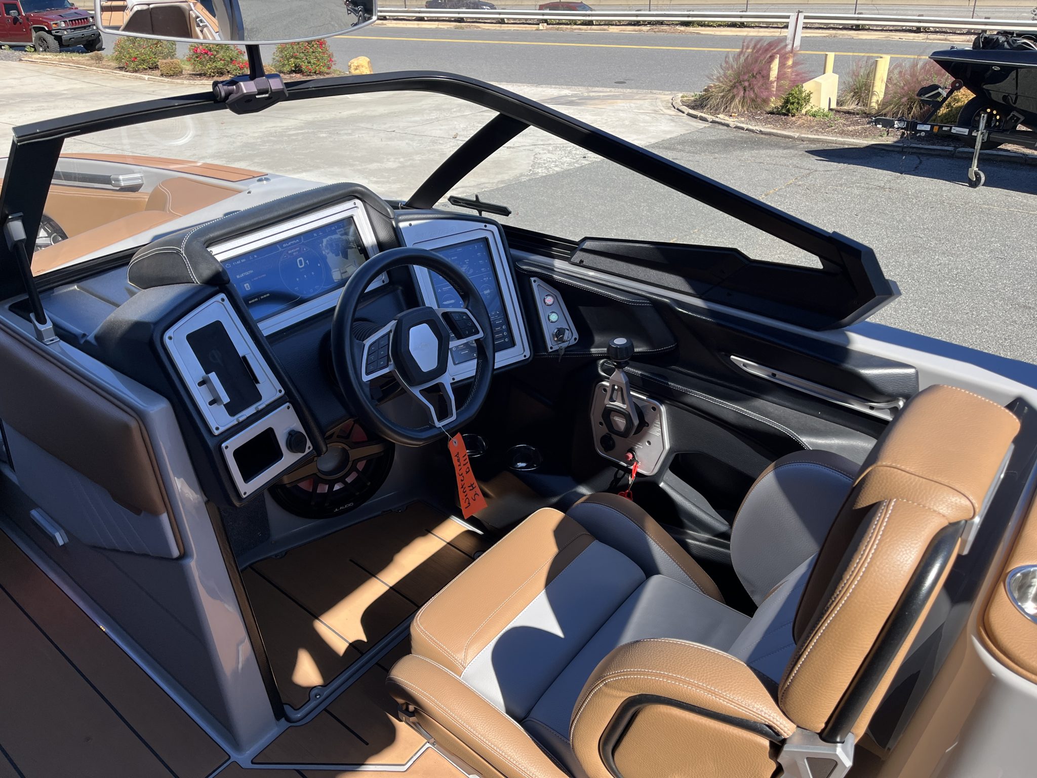 Inside, the Supra SA 450 seats up to 16 people in a cabin designed for both form and function. The upholstery uses high-quality materials for durability and comfort, with accent stitching that complements the Copper exterior. Each section of seating is smartly placed to encourage socializing while giving passengers a clear view of the action. Hidden storage spaces make it easy to stow gear, and the sound system delivers crisp, powerful audio for on-water entertainment. The driver’s helm is more advanced than ever, featuring a touch control system that lets you manage ballast, speed, lighting, and more with intuitive precision.
