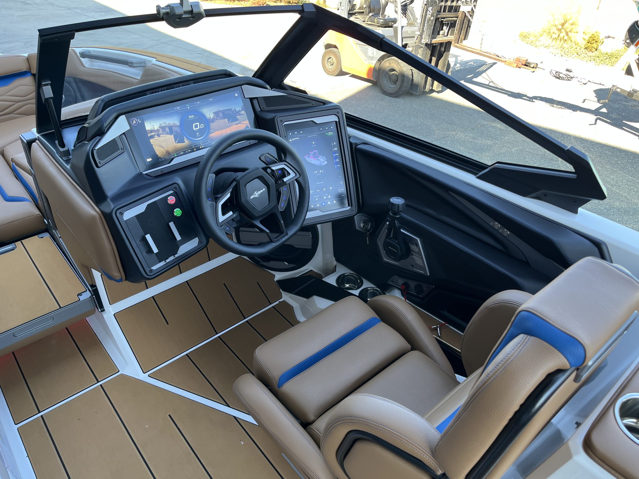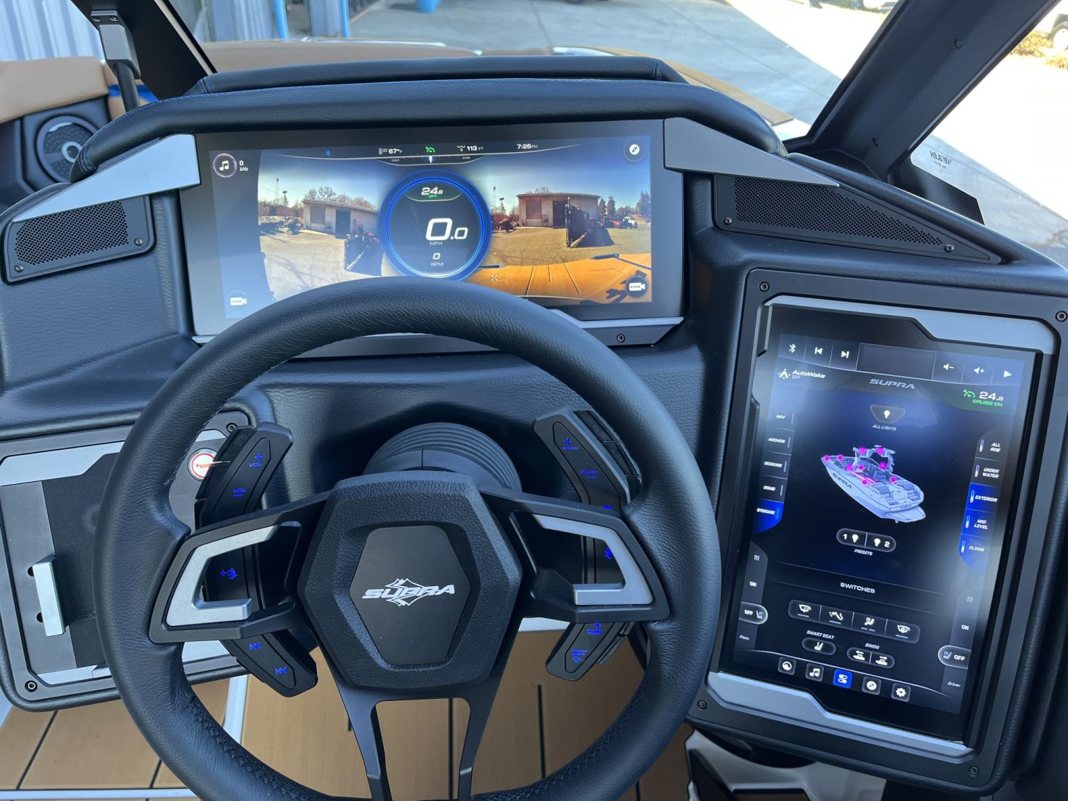 Supra’s tech integration is one of its strongest competitive points. The SA 450 comes standard with Supra Vision Control—a full touchscreen helm system managing ballast, speed control, surf settings, and lighting. In contrast, the Malibu and Nautique models offer comparable control systems, but Supra includes many features as standard equipment that require upgrades in other brands. These include the Swim Platform Camera, Patented AutoWake System, and Clamping Board Racks.