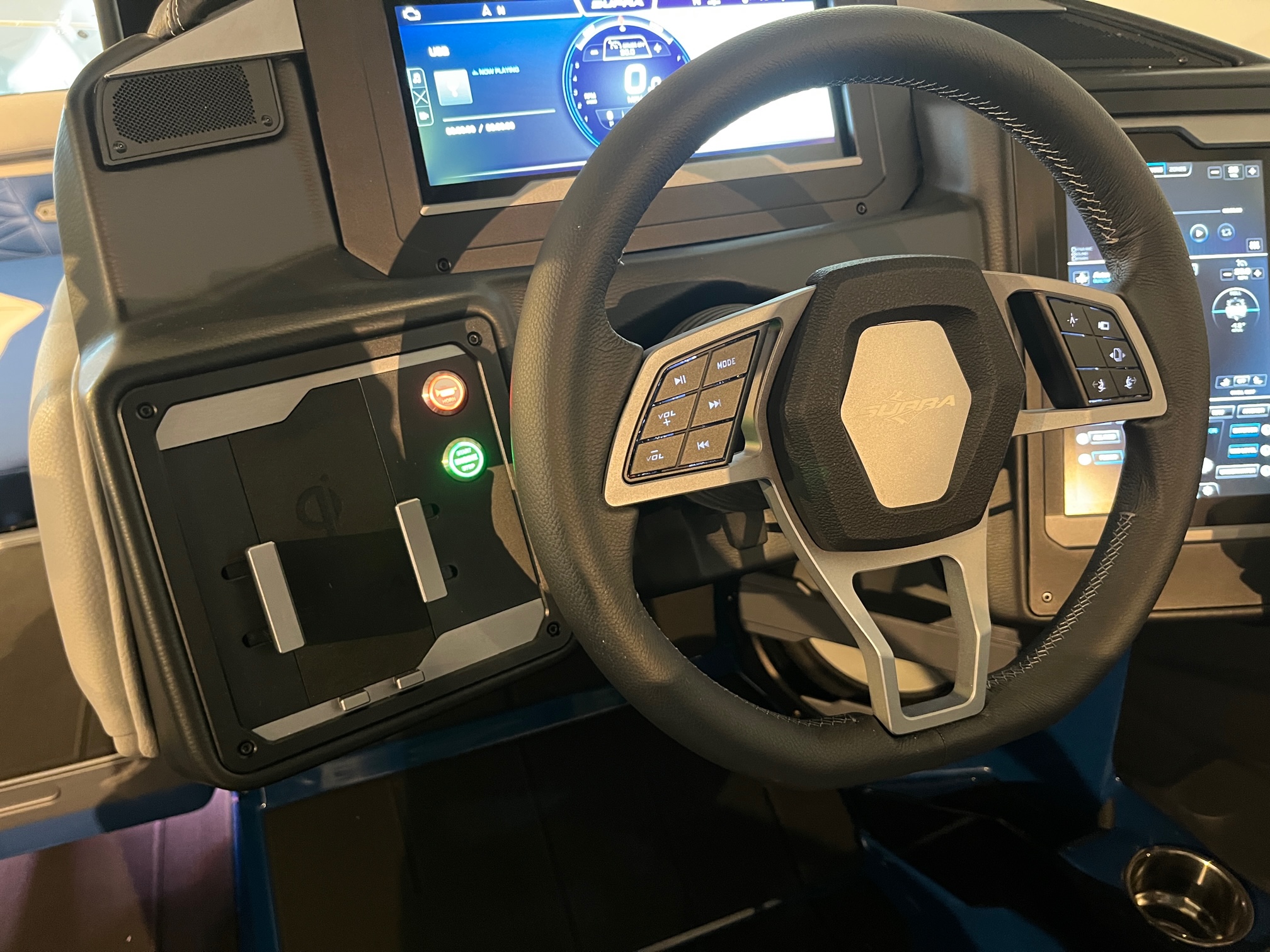 At the helm, Supra’s Vision Control dash provides full command over performance settings and comfort systems. Multi-touch displays show everything from ballast levels to surf profiles, engine data, and navigation features—all instantly accessible with intuitive controls. It’s designed to keep operation simple and precise, helping captains of any experience level craft the perfect ride.