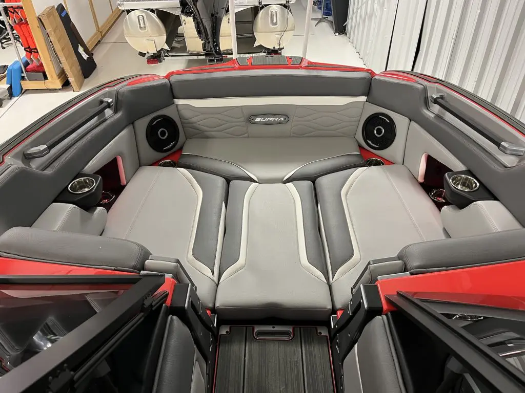 - Advanced Technology at Your Fingertips: The Supra SE is packed with state-of-the-art tech including: Dual 12.8-inch touchscreen displays for intuitive control of boat functions. JL Audio premium sound system to bring the party to the water. Heated captain’s chair and steering wheel for all-season comfort. RGB interior and underwater lighting for and unforgettable nighttime vibe.