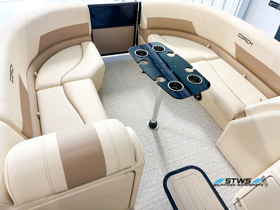 Coach’s approach to pontoon design centers around function and comfort merged seamlessly. The FLC 243 features a spacious deck with multiple seating zones that easily accommodate nine passengers. Premium marine-grade vinyl and supportive cushioning allow long, comfortable rides, while the rear loungers and captain’s helm create both an inviting social space and a confident command post. The traditional layout provides excellent flow, and each seat base includes storage to keep gear organized. Attention to detail is evident everywhere—the stainless-steel railings, polished cleats, and carefully integrated helm components show the brand’s dedication to long-term value. The interior layout blends practicality and modern design, giving this pontoon a polished look without being overly flashy. LED courtesy lighting, a well-situated sound system, and easy access swim platforms make every outing relaxed and enjoyable.