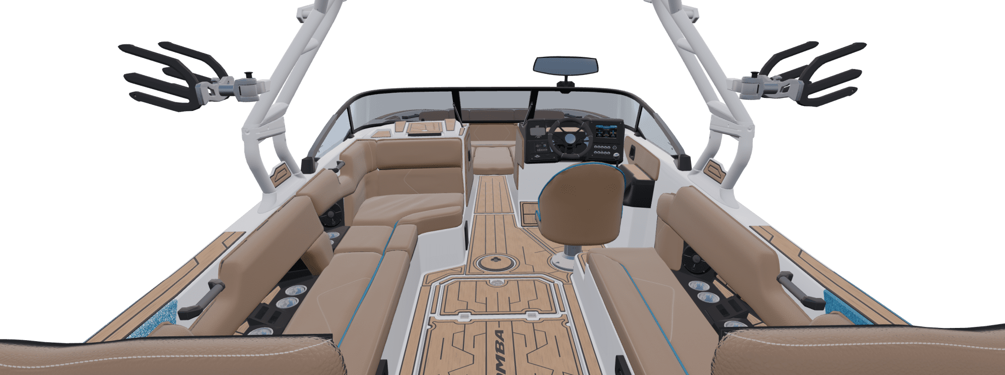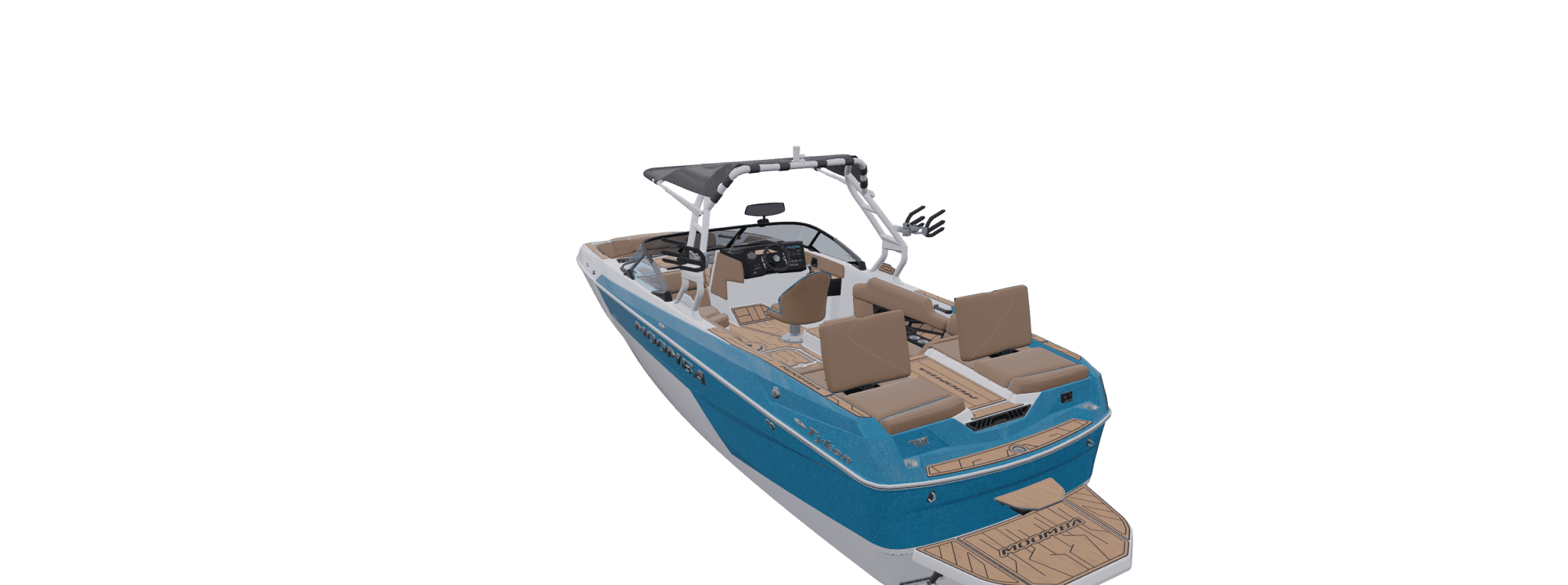 Inside, the Tykon’s tan upholstery contrasts perfectly with the metallic blue exterior. The layout offers abundant seating for up to 18 people, supported by multi-density foam and marine-grade finishes that resist heat and moisture. Every lounge area is functional — converting easily to spot riders, stretch out, or face the water. Integrated storage beneath each cushion ensures all gear stays protected and accessible. Technologically, Moomba continues its trend of driver confidence systems. The digital dash integrates all surf, speed control, and ballast information in one interface. Switch between profiles easily — whether you’re teaching beginners or dialing in a competition-style setup for advanced riders. LED lighting, audio control, and climate-friendly surfaces make long days more enjoyable and cleanup simple.