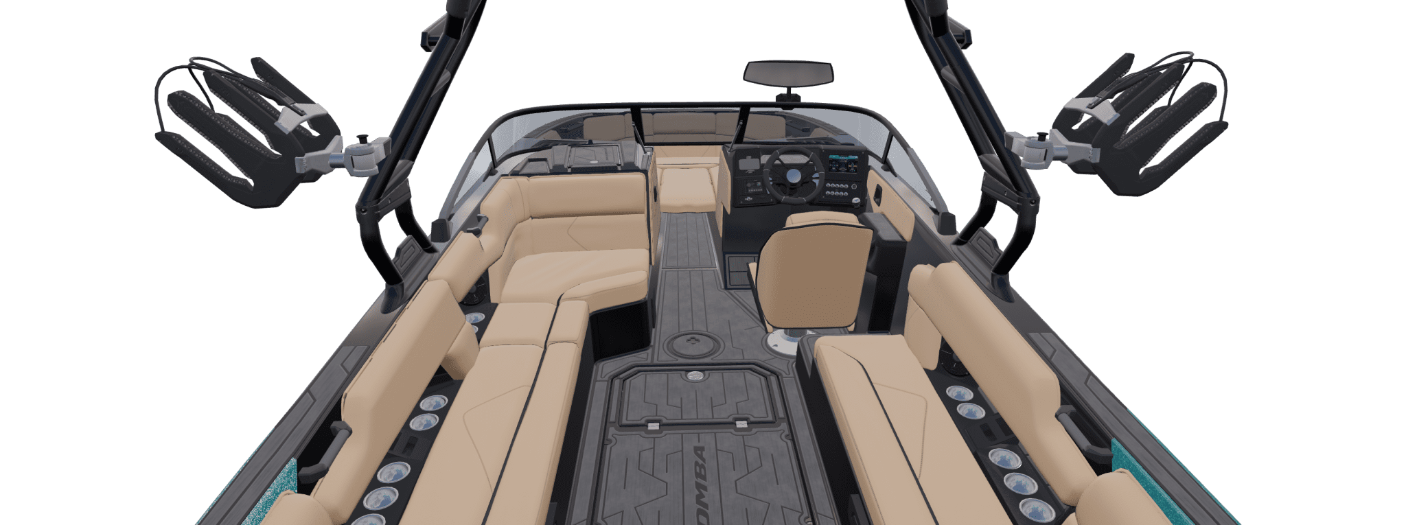 Inside, the 2026 Tykon is all about space and comfort. The tan interior pairs beautifully with the Aqua Flake exterior, offering a refined yet sporty appearance. The wraparound seating is designed for 18 passengers, giving everyone a comfortable place to relax. Everything from the non-slip flooring to the stitched upholstery speaks to Moomba’s commitment to quality and design. The helm setup features clear digital displays, ergonomic control placement, and intuitive functionality. Storage is abundant, with compartments built to store boards, ropes, and gear while keeping the walkways uncluttered. LED accent lighting and a premium sound system contribute to a relaxing atmosphere when the sun goes down.