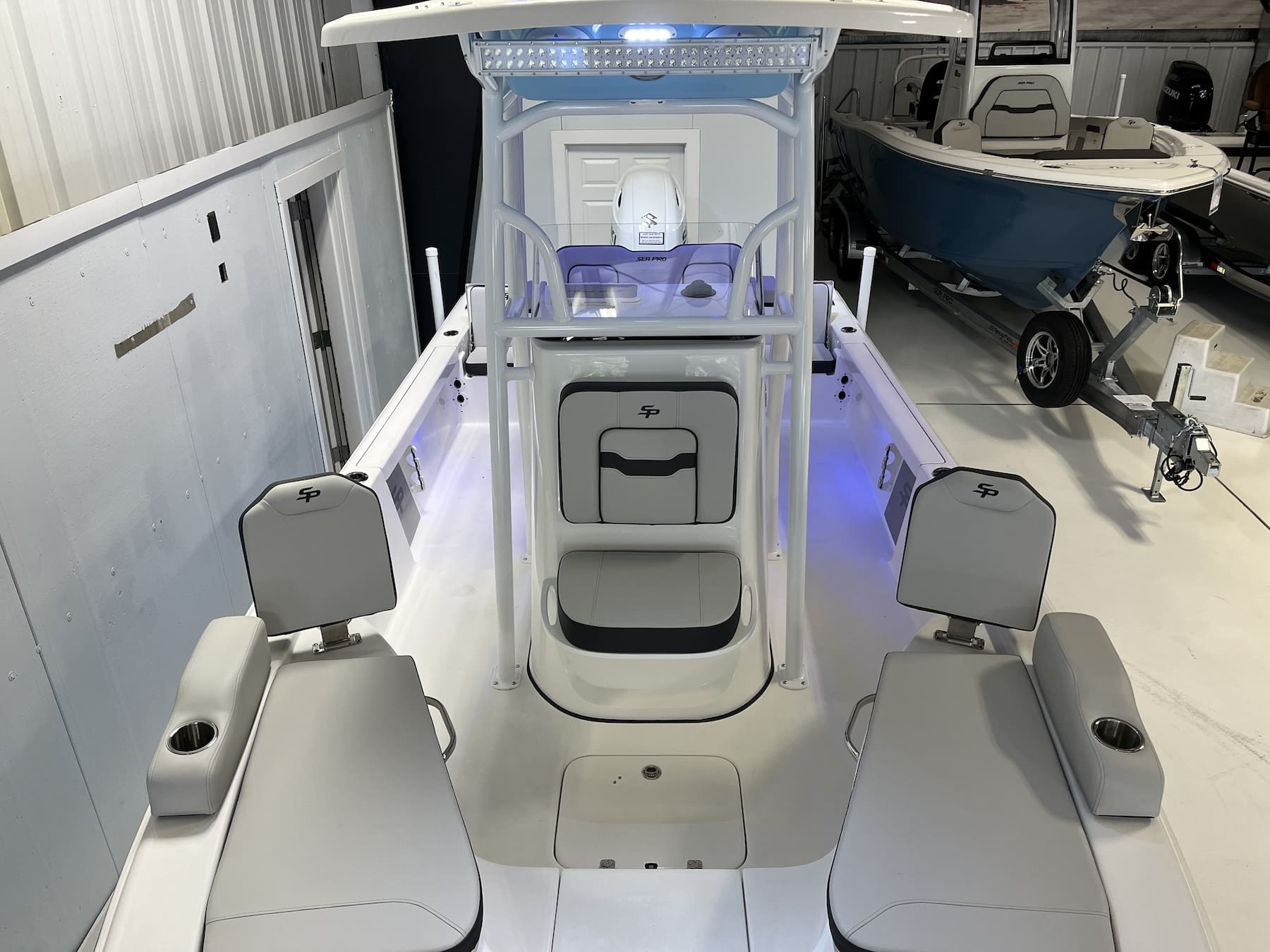 The helm is both intuitive and modern. The console accommodates large multi-function displays, engine gauges, stereo controls, and all necessary switches within easy reach. The weight and balance make for stable steering at any speed, while Sea Pro’s solid construction ensures the driver feels connected to the hull rather than isolated from it. The windshield and console design improve airflow without creating excessive drag, contributing to better comfort underway.