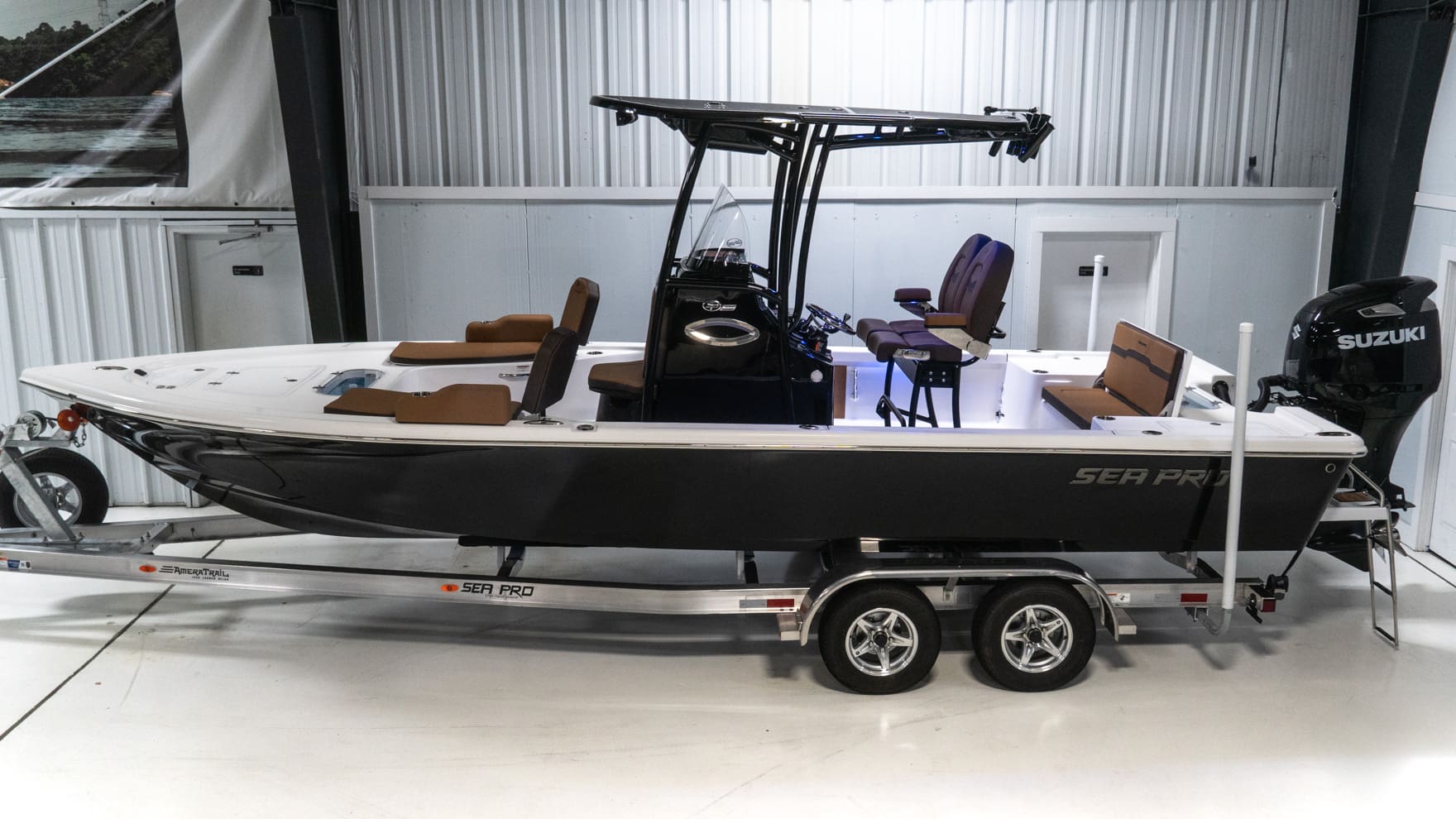 Power comes from Suzuki’s DF300APX, a 300-horsepower four-stroke known for efficient performance, strong acceleration, and reliable handling across a wide range of conditions. This engine is paired seamlessly with Sea Pro’s advanced hull design, ensuring smooth operation even when crossing boat wakes or afternoon chop. For those who enjoy pulling a wakeboarder at Jordan Lake or towing a tube near the Neuse River, the consistent torque makes a noticeable difference. At cruising speeds, the DF300APX runs quietly and efficiently, thanks to its lean-burn control system, giving you more time on the water between fuel stops.