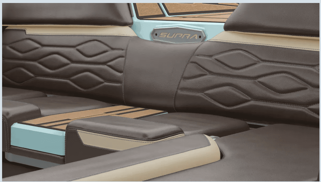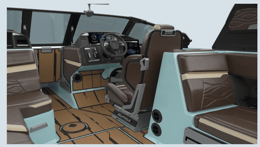 Supra’s construction process emphasizes structural integrity through hand-laid fiberglass, high-density foam flotation, and stainless-steel hardware. The attention to fit and finish is evident throughout—from premium upholstery stitching to molded non-skid flooring. While MasterCraft boats are known for excellent build quality and Nautique’s G-series for luxury detailing, the SA 450 achieves similar refinement at a more competitive overall price point. The interior is practical yet upscale, offering multiple seating configurations that maximize usable space on its 22.5-foot footprint.