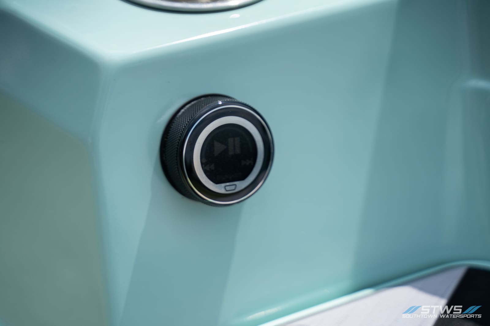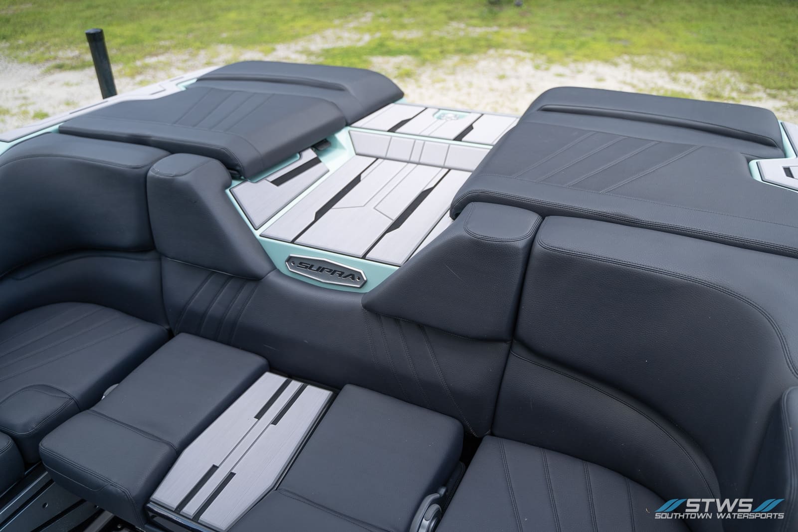The crisp Spearmint hull color draws attention whether launching at the ramp or cruising past docks on Falls Lake. Black upholstery accents frame the layout in modern simplicity, while stitching patterns and textures create visual movement. Supra’s design team clearly aimed to merge aesthetics with ergonomics, producing a layout that’s both striking and functional. The transom area doubles as a social platform, ideal for gearing up, relaxing, or swapping boards during sessions.