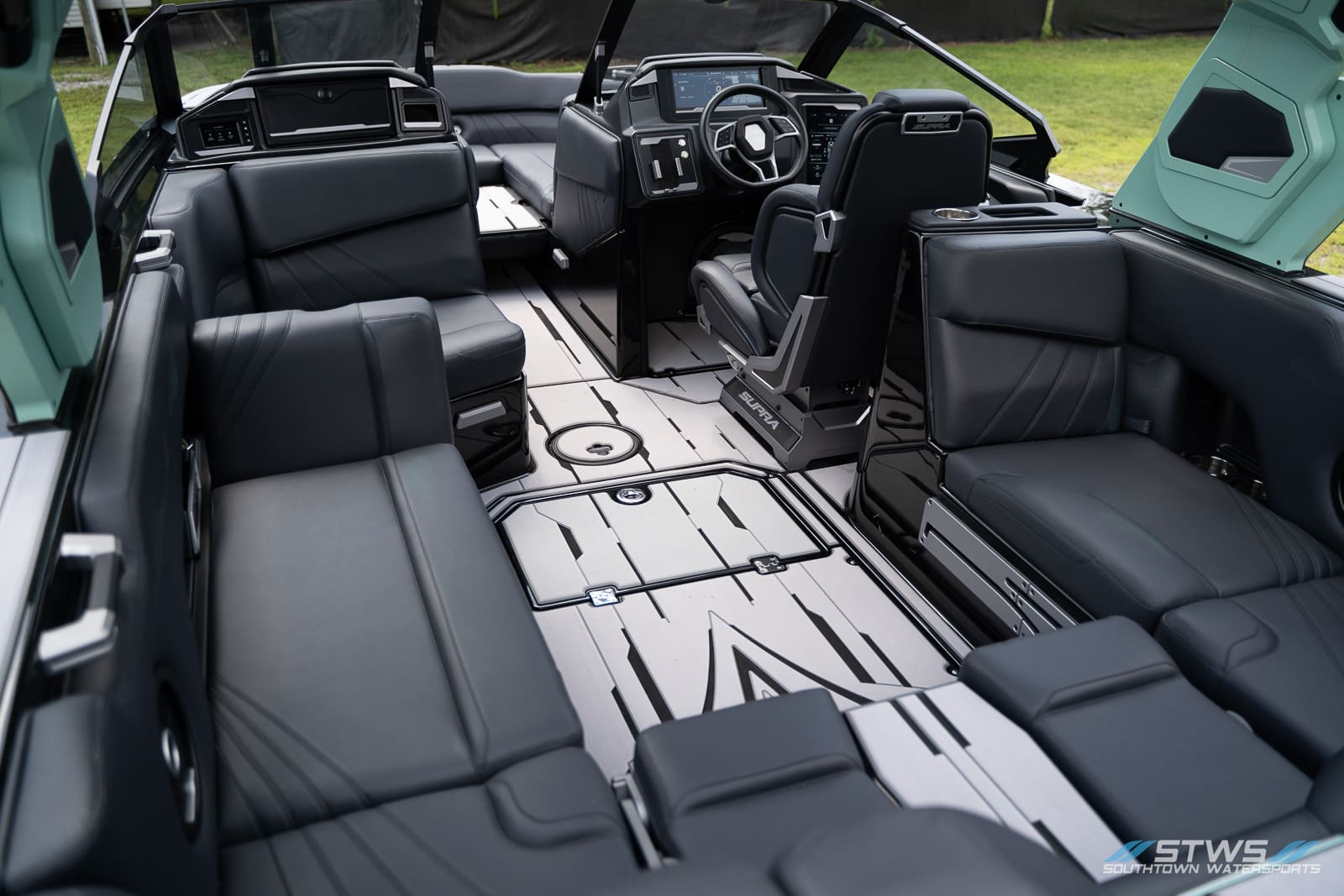 Supra’s interior materials are built for longevity. UV-protected vinyl, durable marine stitching, and sealed foam ensure that even repeated exposure to sun and spray won’t degrade performance. The thick-cut flooring adheres tightly to its contours, eliminating lift or bubbling even after repeated wet-dry cycles. Maintenance access points are intelligently placed, making servicing and cleaning more efficient.